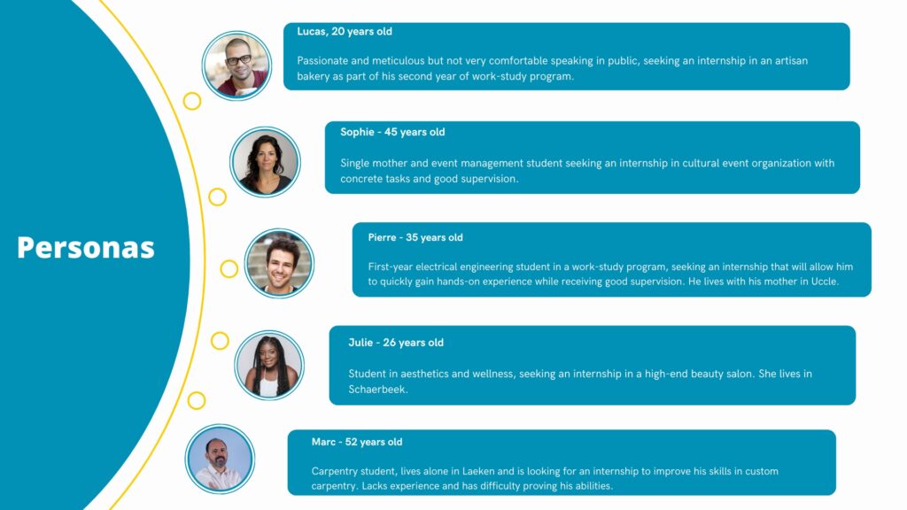 We started by creating personas to represent different types of students looking for internships, identifying their needs, goals, and frustrations. Then, we conducted a competitive analysis to study existing internship platforms and highlight opportunities for improvement in usability and clarity.